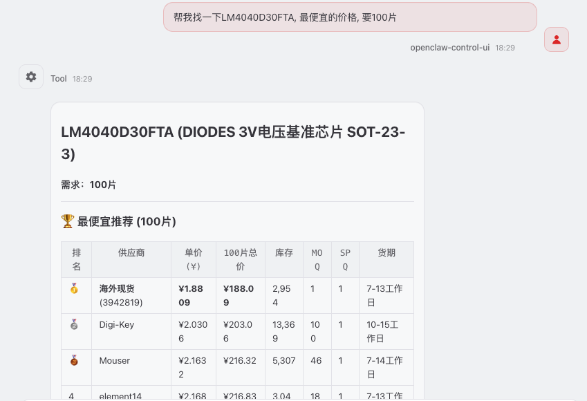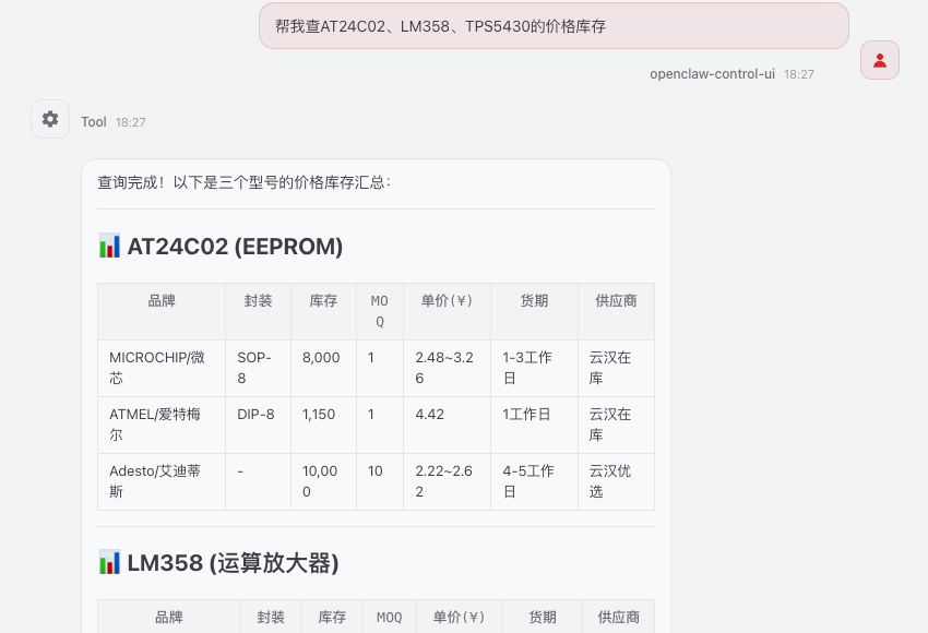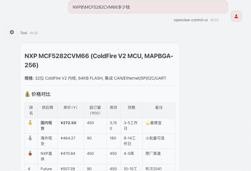 下图为线上真实使用记录:用自然语言描述型号、数量与交期等条件后,Skill 会调用云汉芯城数据,在对话中返回报价表多档推荐采购建议等结构化结果,无需再切网页查价