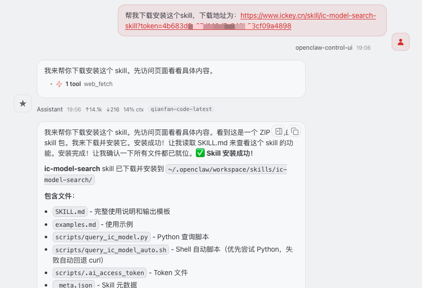 将链接粘贴到对话中并发送后,龙虾会自动拉取并完成安装;成功后在对话里可看到安装路径与 Skill 能力说明。