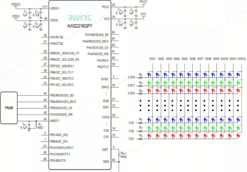 (AW22216应用原理图,来自艾为规格书)