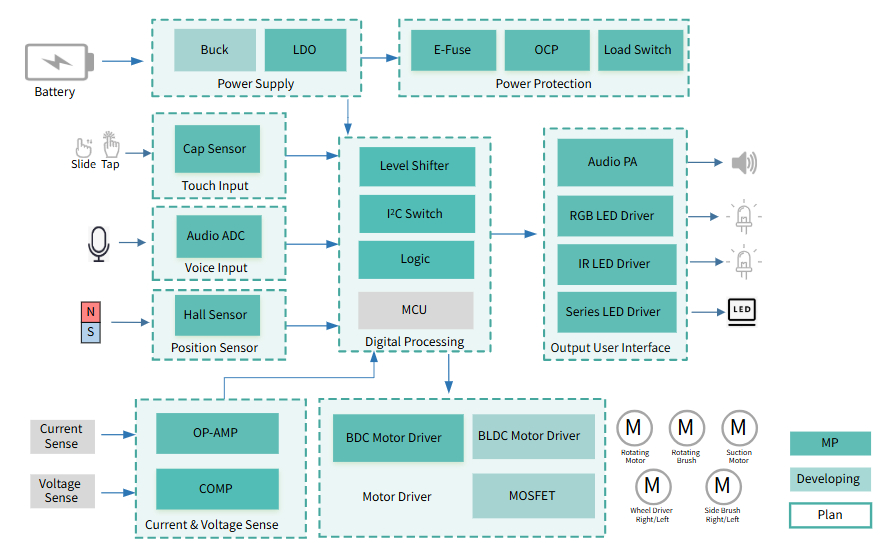(扫地机器人框图,图片来自艾为官网扫地机器人应用方案 | 艾为电子)
